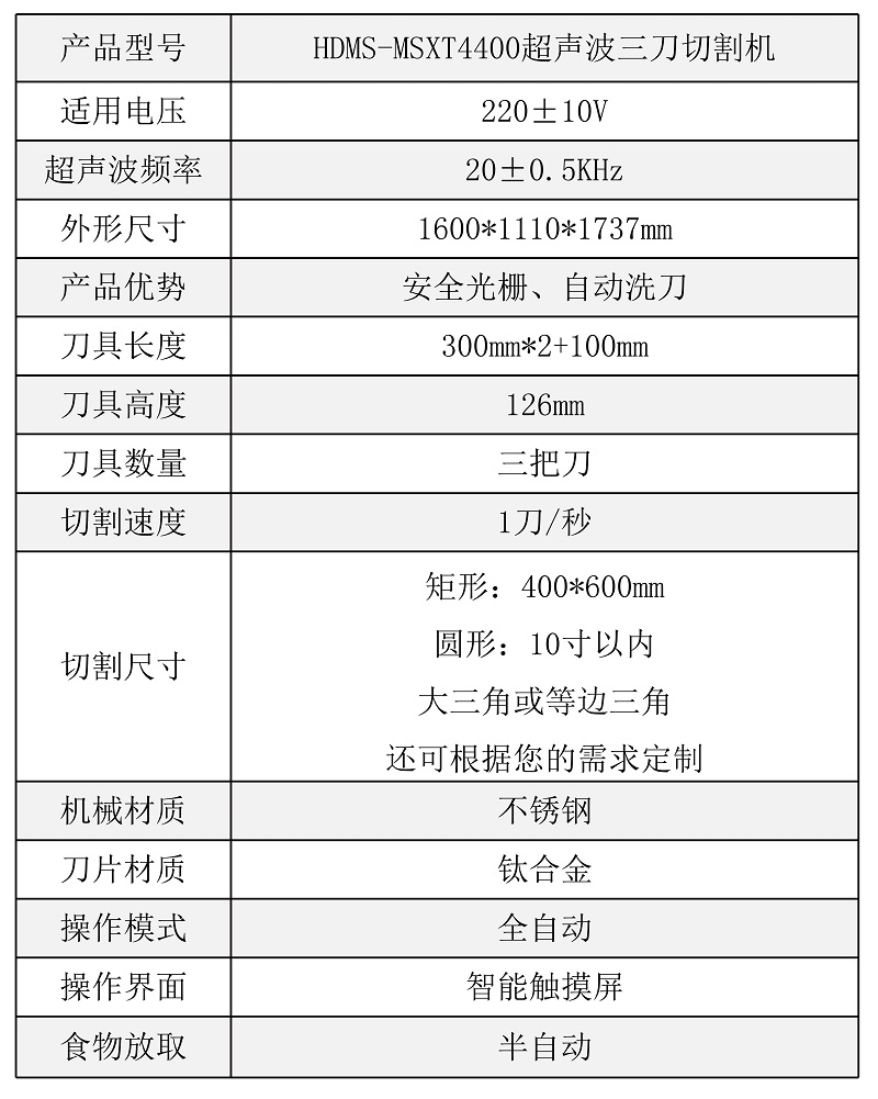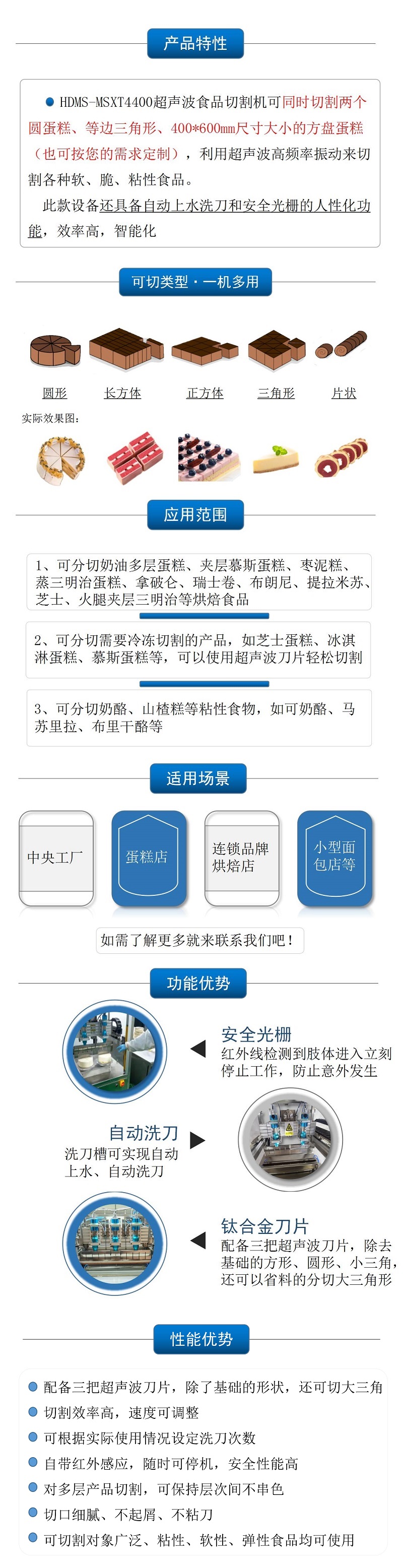 该设备配备双把超声波刀片,既可切方蛋糕,也可同时切两个圆蛋糕,还具有自动上水洗刀、安全光栅的人性化功能,效率高,更方便 |
