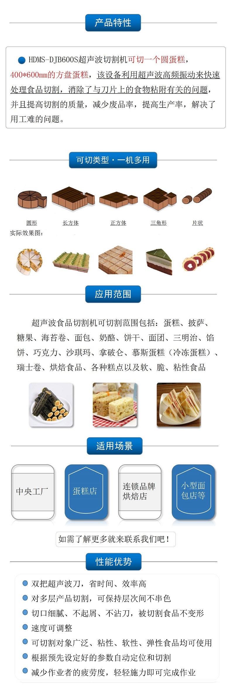 该设备配备双把超声波刀片,既可切方蛋糕,也可同时切两个圆蛋糕,还具有自动上水洗刀、安全光栅的人性化功能,效率高,更方便