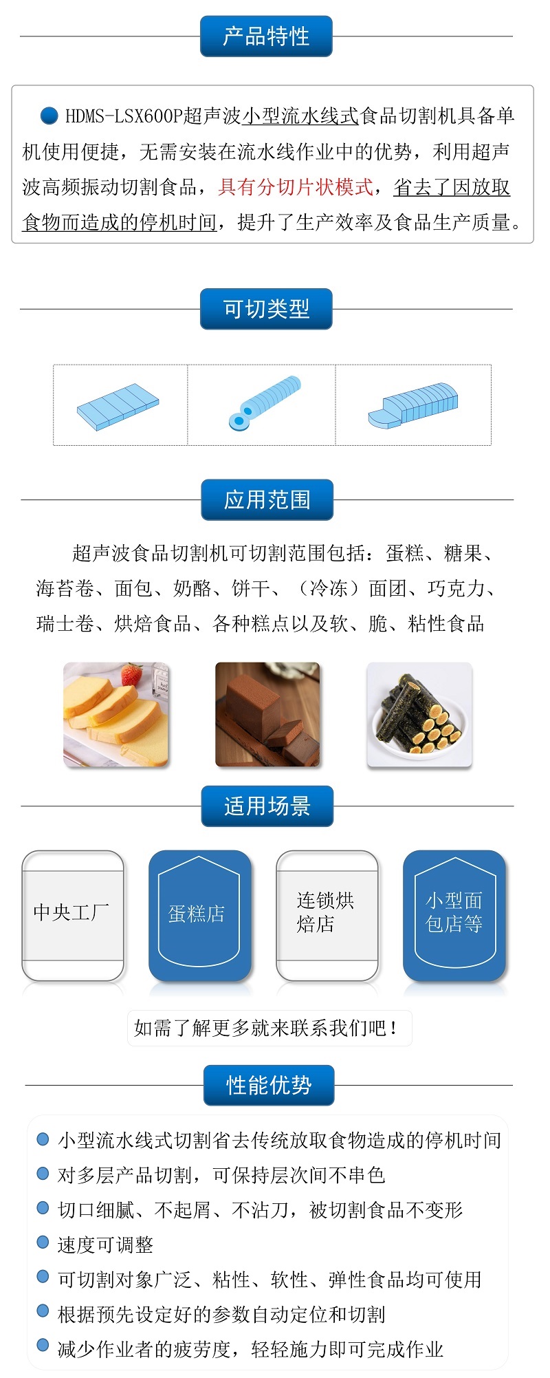 该设备配备双把超声波刀片,既可切方蛋糕,也可同时切两个圆蛋糕,还具有自动上水洗刀、安全光栅的人性化功能,效率高,更方便
