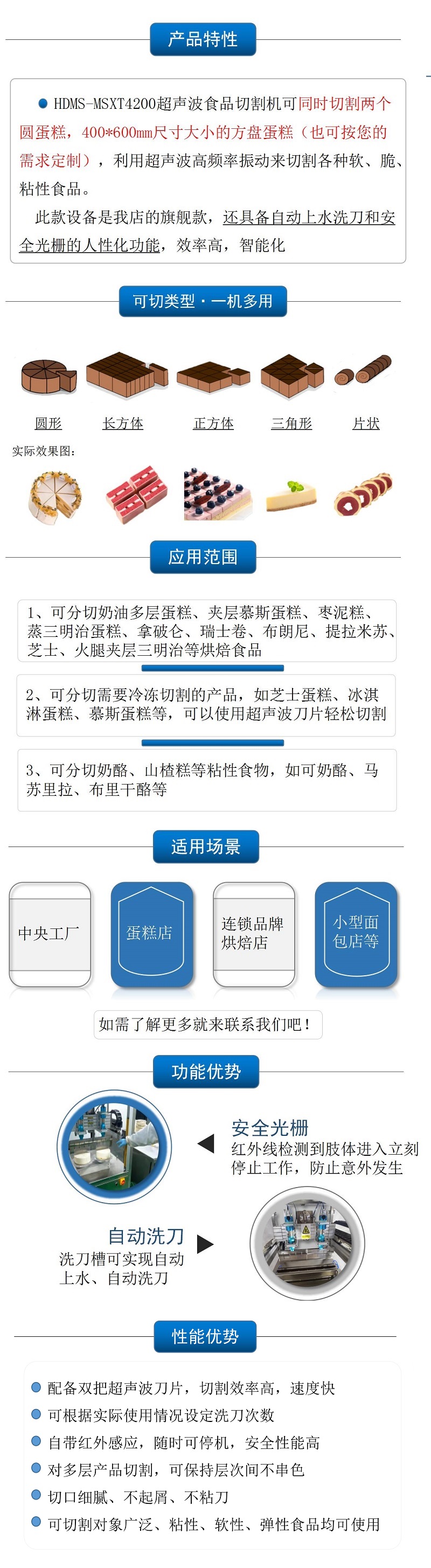 该设备配备单把超声波刀片,可切圆形(只限一个圆蛋糕),也可切方形