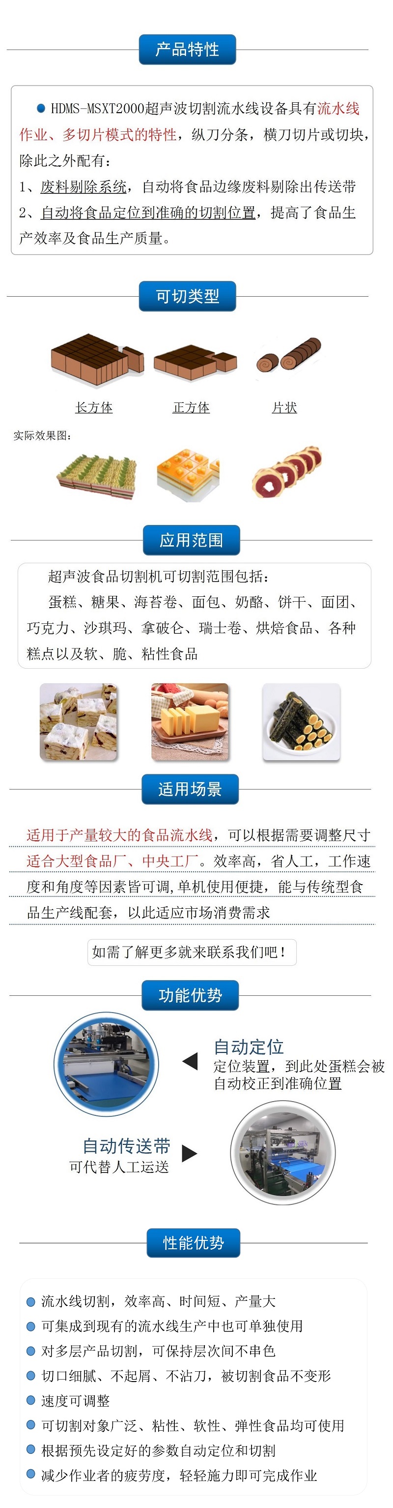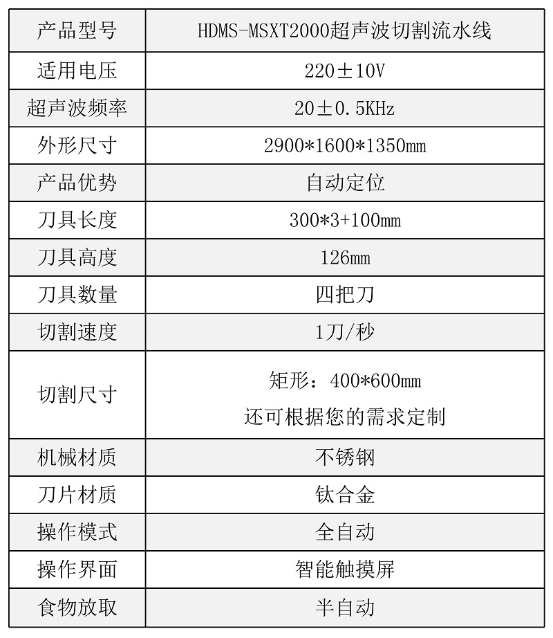 该设备配备双把超声波刀片,既可切方蛋糕,也可同时切两个圆蛋糕,还具有自动上水洗刀、安全光栅的人性化功能,效率高,更方便 |